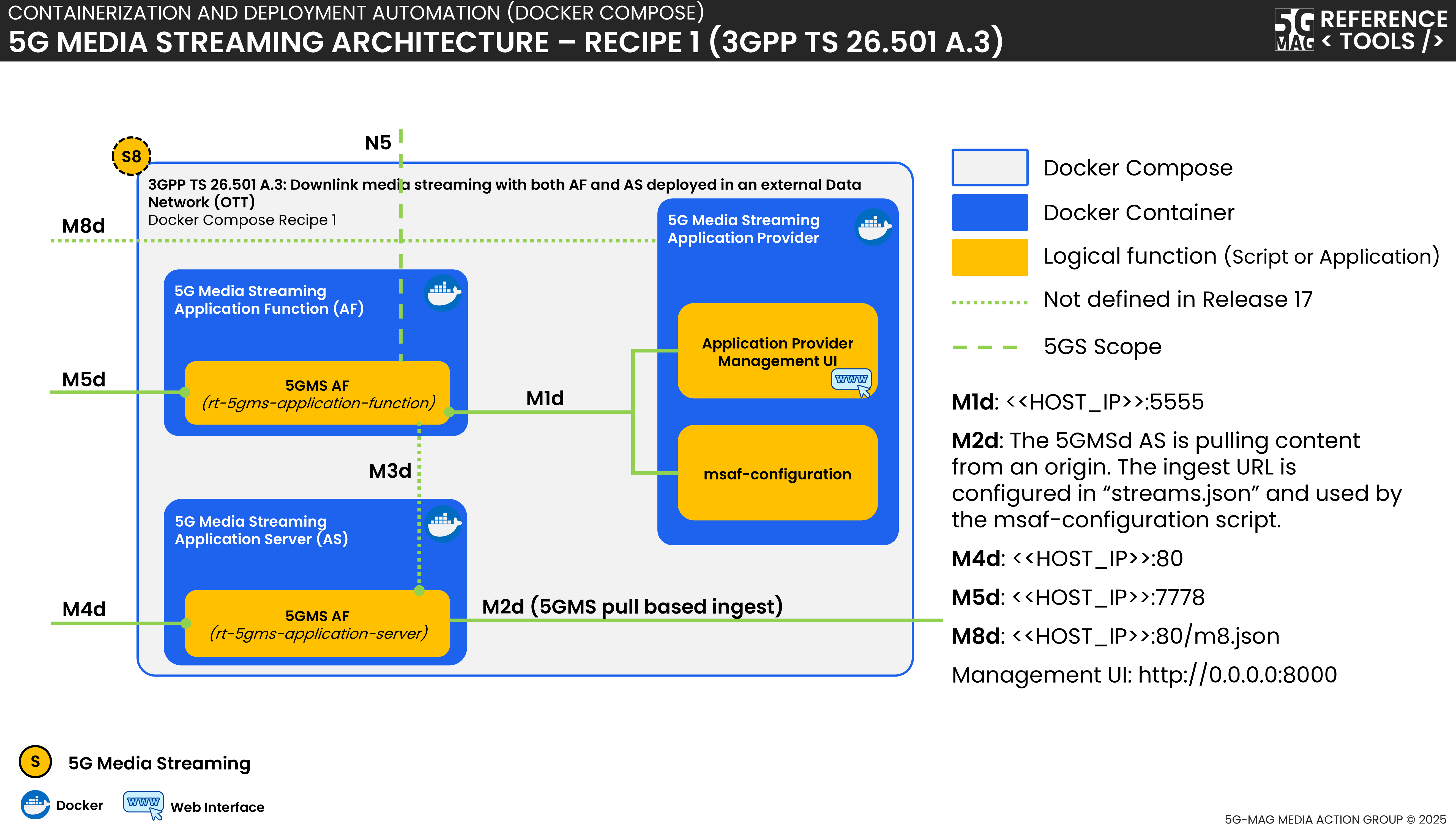 Docker-Compose setups are provided to run the 5GMS Application Function, the 5GMS Application Server and the 5GMS Application Provider in Docker container environments.