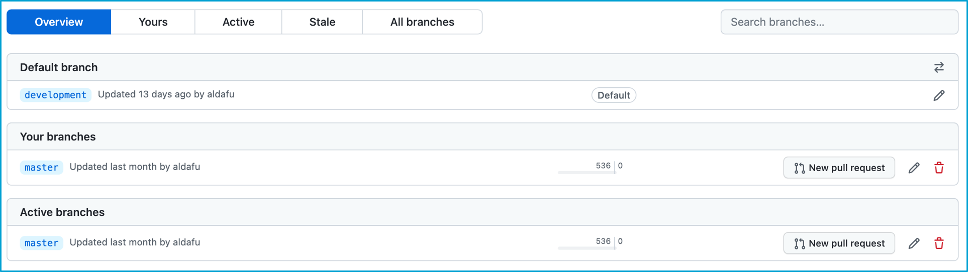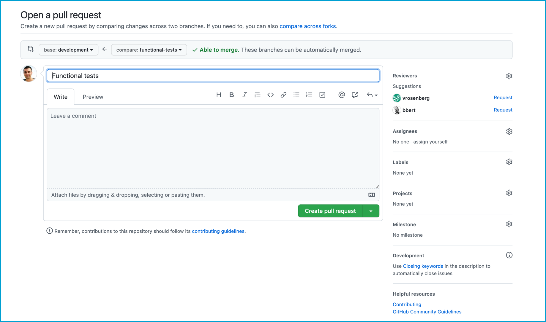 Once a feature or a hotfix branch is completed a new pull request against the development (in case of feature branches) or the main branch (in case of hotfix branches) is created: