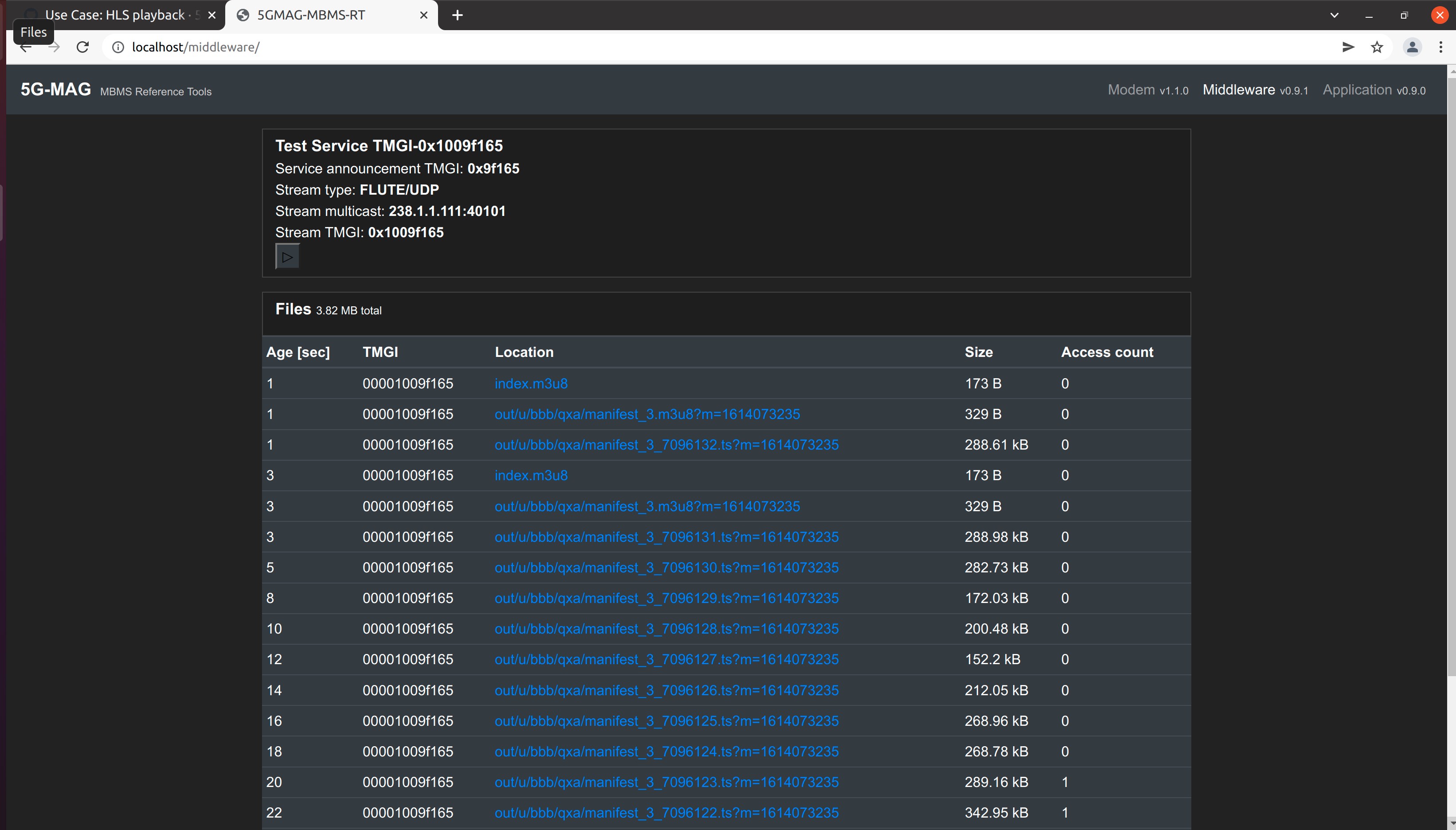 We use the Web User Interface to monitor the MBMS Modem and the MBMS Middleware. Moreover, we use the hls.js integration to playback the final HLS stream. In order run the Webinterface perform the steps describe here.