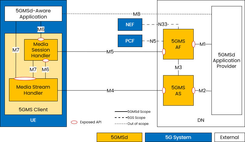 | M5d | Media Session Handling API | Control-plane APIs between the 5GMSd AF and Media Session Handler for session control, QoE reporting, and security (auth/auth). |