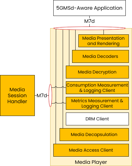 | M7d | UE Media Player APIs | Internal UE APIs used by the 5GMSd-Aware App and Session Handler to control playback and media engine functions. |