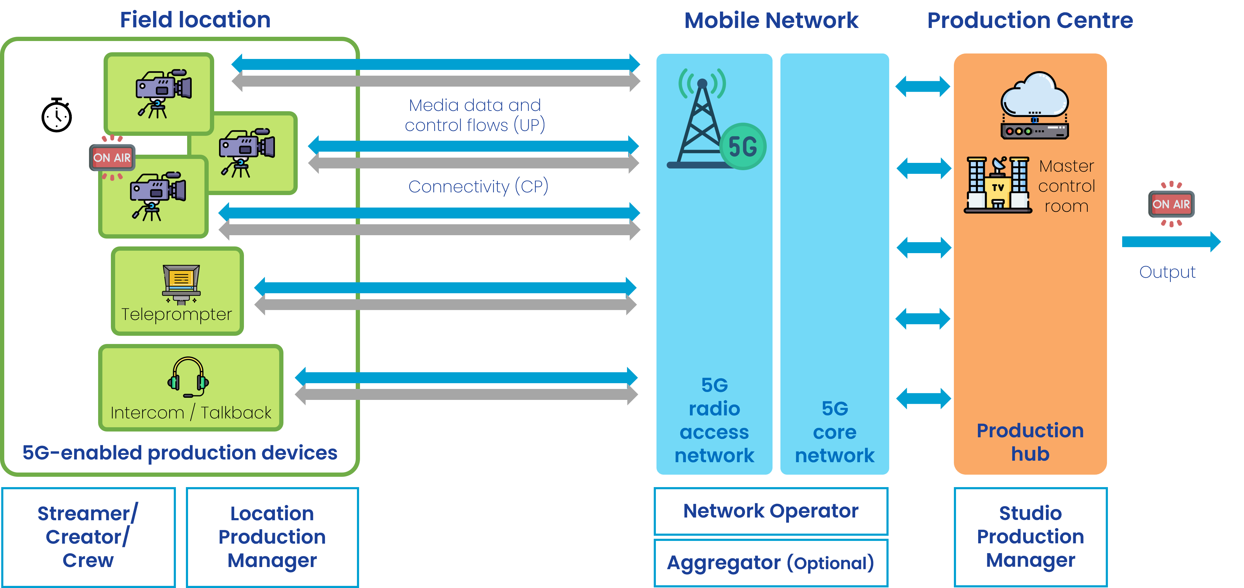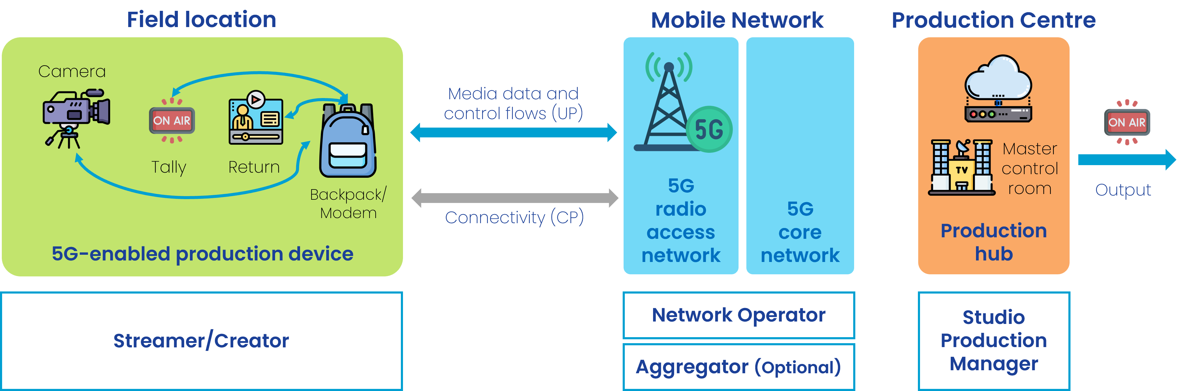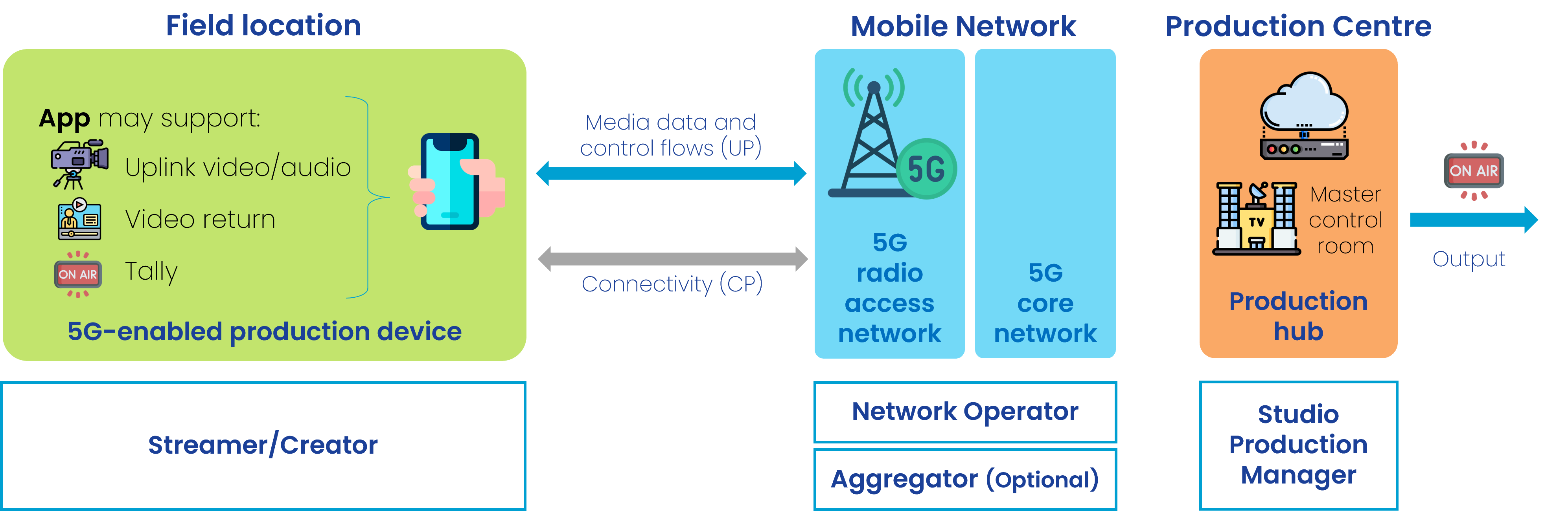 - Production Device (such as a smartphone or a camera attached which is connected to a modem or a backpack), used by the streamer/creator. The device contains at least one UE with a Subscription (SIM) and can host one or more client applications. A client application can be a video capturing and encoding application, which generates and sends a continuous video stream to a receiving Media Server.